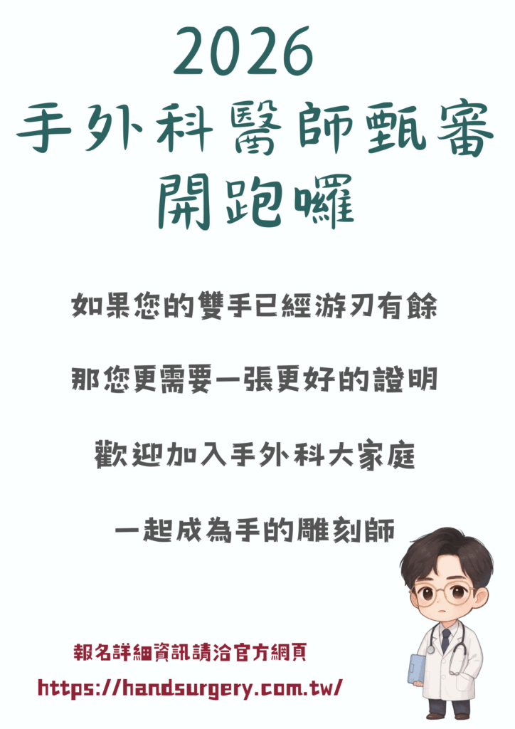 台灣手外科醫學會訂於115年4月11日舉辦「2026台灣手外科醫學會專科醫師考試」